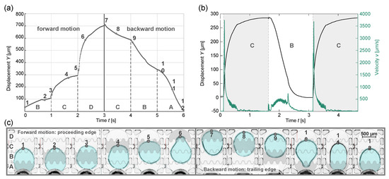 The motion curve with corresponding frames from the high-speed video clip is shown in Figure 4. The graph (Figure 4a) shows the displacement Y of the tracked point of the drop contour over time and an image sequence (Figure 4c) that corresponds to captures of the EHD cell at the designated points. Hereby, the deformation of the droplet during the different phases of the motion is recognizable. Active electrodes are indicated by a semitransparent gray overlay, and electrode and fluidic barrier outlines are emphasized by contour lines. The motion sequence is divided into two sections: the forward motion where the tracked edge is actively pulled by the LDEP force (proceeding edge) and the backward motion where the edge is passively dragged (proceeding edge). By considering the droplet outline, its position and its displacement, it becomes clear that the position changes considerably slower during the transition from one active electrode to the next. For example, this behavior can be seen between points 4 and 5 in Figure 4a. From this observation, it becomes apparent that the droplet approaches its final position asymptotically, which results in plateaus in the motion curve at each electrode transition. The monitored characteristics are valid for both directions of motion, whereby the trailing edge has a delayed response as expected due to viscosity and fluidic friction with the ambient liquid.