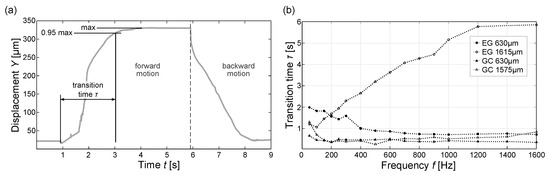 Based on this approach, the motion of different-sized droplets of EG and GC was analyzed in the frequency range from 50 to 1600 . For each liquid, droplets with a diameter of 630 and a length of 1575–1615 were analyzed. For each data point, a series of five to six motion sequences was recorded and averaged. The thus obtained graphs of the time constant versus excitation frequency are shown in Figure 5b. From this first study, it is clearly visible that the frequency has an impact on the achieved transition time. This influence seems to vary for the different droplet liquids. Furthermore, the droplet size apparently also affects the response. As shown in Figure 5b, the transition time for a 630 droplet of EG decreases with increasing frequency. For a droplet with a length of 1615 , however, the behavior can be observed to be exactly the opposite. In both cases, saturates at a final value. In contrast, for GC, both the larger and the smaller droplet show similar behavior. With increasing excitation frequency, the transition time decreases and seems to saturate at a minimum value. Furthermore, the difference between and is noticeably smaller compared to EG. The respective maximum and minimum transition times for the studied liquids and droplet sizes are summarized in Table 2. Here, the strong dependence of the large EC drop is clearly indicated by the ratio between and , which is larger by a factor of two than in the other cases. Overall, motion times for GC are lower than for EG, which shows a stronger response to a frequency variation. Furthermore, larger droplets show a stronger frequency dependence compared to smaller droplets. The impact of the droplet size on the transition time gives an indication that there might be a correlation between the excited vibration and the eigenfrequency of the droplet.