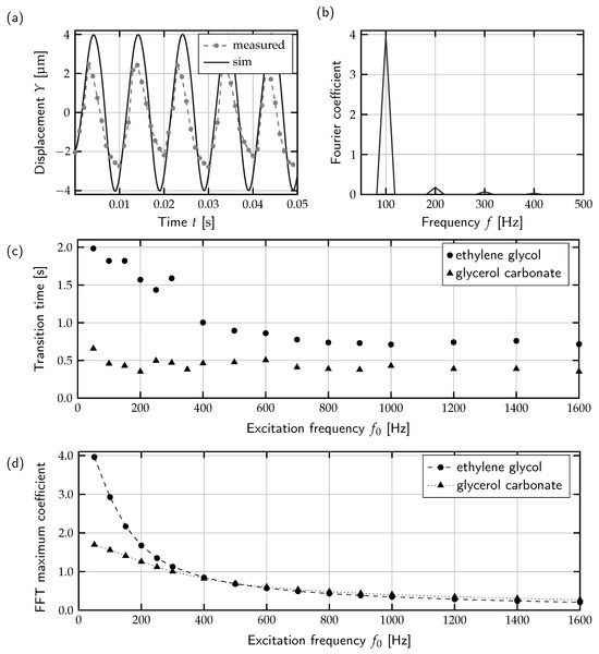 Numerical calculation of droplet contour vibration: (a) measured and simulated displacement at an excitation frequency 50 and (b) corresponding FFT response, (c) measured transition time depending on excitation frequency for droplets of EG and GC with a diameter of 630 and (d) peak values of FFT response for droplet contour vibration of EG and GC with a diameter of 630 .