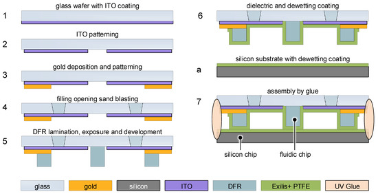 The fabrication of the EHD cells was carried out at the technology center of the Institute of Micro- and Nanotechnologies (IMN). In Figure 7, the fabrication flow is shown. Base substrates are Eagle XG® glass wafers carrying 60 of ITO (1). In the first step, the ITO electrodes are patterned by a wet chemical etching process (2). Then, 400 gold for contact pads is deposited and subsequently structured, also by wet chemical etching (3). A thin layer of chromium (30 ) serves as adhesion promoter between gold and ITO/glass. In the next step, the filling openings are generated by a powder-blasting process (4). The fluid walls (100 ) are obtained by double lamination and photolithographic patterning of Ordyl SY355 permanent dry film resist (5). The entire fluid chamber is covered with Exilis dielectric (300 ) and PTFE (50 ) as dewetting layer, both deposited at room temperature from vapor phase by a commercial supplier (6). Areas not to be coated are covered with tape during deposition. The optical substrate is covered with FDTS as dewetting layer from vapor phase (a). In the concluding step, LDEP and optical substrate are assembled by UV-curing glue (7).