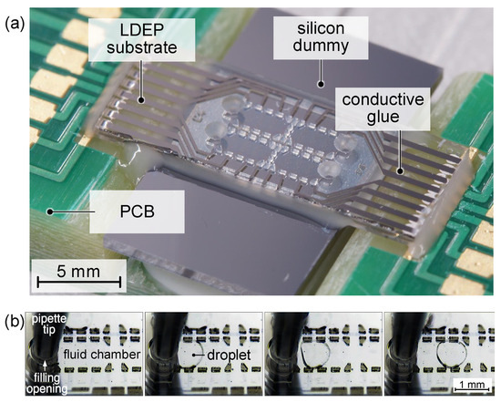 LDEP and optical sample are aligned and assembled together using a micromounting tool. Bonding and fluidic sealing are obtained by application of the UV-curing glue DELO® Katiobond® LP655 along the outline of the fluidic cell. The adhesive features a superior chemical resistance and is thus stable to the applied liquids. For the experimental investigation of the behavior of the liquids under LDEP actuation, PTFE-coated silicon dummy chips are used instead of optical substrates due to their limited availability. As the surface is covered by a dewetting coating, this modification has no impact on the LDEP response of the liquids compared to a photonic integrated circuit with identical coating. Electrical contact with the printed circuit board (PCB) is made by conductive adhesive, see Figure 8a.