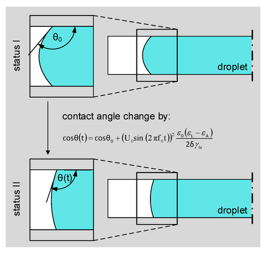 where and are the relative permittivities of droplet liquid and ambient fluid, respectively, and is the penetration depth of the electric field into the liquid. The term “dielectrowetting” (DEW) was introduced to distinguish this setup from classic LDEP actuation. DEW gained attention for its potential to overcome the limitations of electrowetting (EW), another EHD driving mechanism. In EW, the apparent angle of a conducting droplet can be modulated by the application of the potential between the droplet and the conducting surface, which are separated by a thin insulating layer in the electrowetting-on-dielectrics (EWOD) configuration. EWOD can only be applied on conducting liquids, whereas DEW can be employed on both conducting and dielectric liquids, depending on the frequency of the driving voltage. Furthermore, it was demonstrated that contact angle saturation, as known from EWOD actuation, is not present during wetting manipulation by DEW [22].