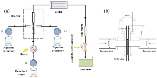 An effective way to enhance solution mixing in a CHFS system is to design and configure a proper synthesis reactor. The first ever continuous micro T-shaped mixing reactor used in hydrothermal synthesis was introduced by T. Adschiri []. The precursor solution and hot water were premixed at a T mixing point and fed into a vertical stainless-steel tube. The tube served as a heater to maintain the solution at a high temperature for a while. It is believed that a fast hydrothermal reaction happened at the mixing point []. Sue et al. adopted a modified T-mixer design with different diameters for the two inlet pipes [,]. Blood et al. proposed a different microreactor design called a ‘counter-current reactor’ [,]. This type of reactor uses a counter-current configuration for the inlet streams. The SCW flows downwards through a thin tube while a precursor solution is fed upwards, and the two mix with each other at a ‘nozzle’ structure joint point. In this work, a micro confined jet mixer (CJM) reactor was employed in a CHFS system (Figure 1a). The micro confined jet mixer consisted of an inner tube inserting upwards into a larger outer tube (Figure 1b). Superheated water flowed upward in the inner tube to the mixing point, where it mixed with a metal salt solution, which also flowed upward from the two precursor streams. The resulting product stream then flowed upward, leaving the mixer and entering the tubular heat exchanger. CFD simulation results show that the mixing in a confined jet mixer is much faster than in a counter-current reactor, and particles produced using a confined jet mixer have a smaller size and a uniform size distribution compared to those produced using a counter-current reactor [,].