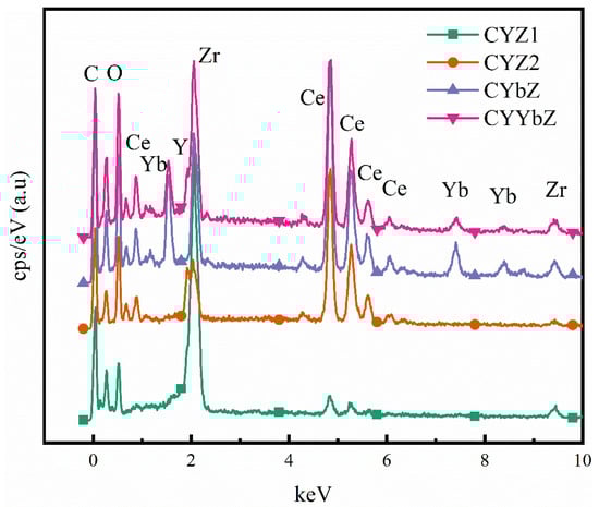 The SEM-EDS energy spectra (Figure 2) and ICP-AES were used to characterize and analyze the chemical compositions and metal element contents of the prepared samples. The four samples of °YZ1, CYZ2, CYbZ, and CYYbZ did not have impurity peaks, and the purity was very high. The C element was produced by the carbon element contained in the conductive adhesive during the preparation process. The stoichiometric ratios obtained via analysis of the metal elements in the four samples were consistent with the initial set ratio and slightly deviated from the initial set ratio. This deviation was caused by the different precipitation kinetics of the different precursors. Precipitation was generated in a short time (only a few seconds), and cations with greater solubility entered the oxide less (see Table 2).