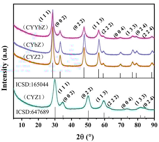 Figure 3 shows the XRD patterns of the four obtained samples, in which the diffraction peaks of CYZ1 at 2θ = 30.119°, 34.918°, 50.212°, 59.673°, 62.617°, 73.745°, 81.669°, and 84.268° correspond to cubic-phase ZrO2 (ICSD: 647689) crystal faces. The diffraction peaks of samples CYZ2, CYbZ, and CYYbZ at 2θ = 28.82°, 33.4°, 47.957°, 56.919°, 59.699°, 70.16°, 77.554°, 79.966°, and 89.480° correspond to cubic-phase CeO2-ZrO2 (ICSD: 165044) crystal faces. The sample CYZ1 exhibited the highest Zr content, while the low Y and Ce contents can be considered as dopants in the ZrO2 crystal lattice, leading to a partial substitution of Zr4+ ions through isomorphic substitution. This conclusion is supported by the XRD results, which revealed that CYZ1 samples doped with small amounts of Y and Ce elements only exhibited characteristic diffraction peaks corresponding to cubic-phase ZrO2. The molar ratios of the Ce and Zr elements in the CYZ2, CYbZ, and CYYbZ samples were the same, which were 70% and 10%, respectively. According to the XRD results, the crystal structures of these three samples were similar, which was consistent with the crystal structure of cubic-phase CeO2-ZrO2. The absence of the characteristic peaks of the doped Y and Yb elements in the XRD pattern indicates that these metal ions dissolved into the crystal lattice and homomorphic substitution occurred. The XRD peak-to-peak pattern of all four samples is wide and the peak intensity is relatively low, which indicates the nanoparticles had a small grain size.