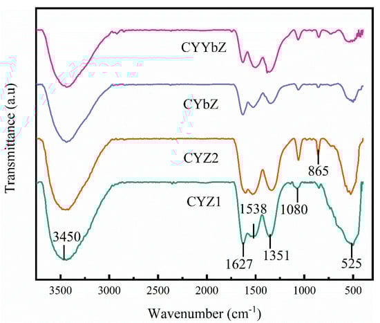 FTIR spectra of the CYZ1, CYZ2, CYbZ, and CYYbZ samples.