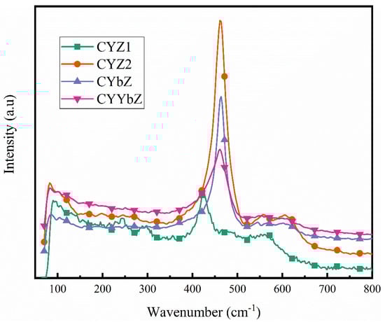 In order to further analyze the phase structure of the four samples, a Raman spectrum analysis was performed on the samples. As shown in Figure 5, the Raman spectra of the four samples all show a strong characteristic peak between 400 and 500 cm−1, which is the characteristic peak of cubic-phase crystals, indicating that the four samples were all cubic phase, which is consistent with the results of the XRD and FTIR spectra above. Among them, the characteristic peak of sample CYZ1 is shifted in the direction of a low wave number. A possible reason for this is that the content of the Zr element in the CYZ1 sample was relatively large and, therefore, the structures of the formed crystals were similar to ZrO2. Combined with the XRD pattern of CYZ1, it can be seen that both of them were cubic-phase ZrO2 crystal structures. The characteristic peaks of the Raman spectra of the CYZ2, CYbZ, and CYYbZ samples are roughly the same. The difference among the three samples is that the contents of the Y and Yb elements were different, but the theoretical contents of the Ce and Zr elements were the same. Combined with the XRD patterns, the crystal structures of the three samples were similar, all of which were cubic-phase CeO2-ZrO2 crystal structures.