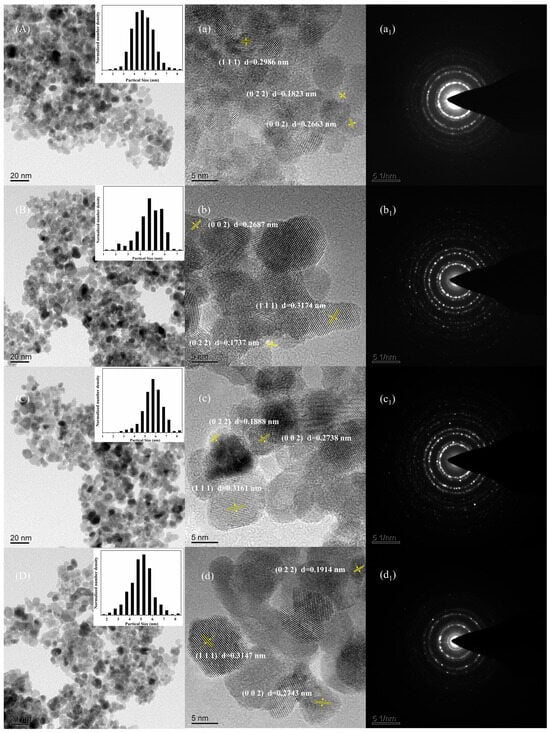 The surface morphology and crystal structure details of the samples were observed via TEM, SAED, and HR-TEM, and the results are shown in Figure 6, where the numbers (A)–(D) represent CYZ1, CYZ2, CYbZ, and CYYbZ, respectively. It can be seen in Figure 6A–D that all samples had a uniform particle shape and a narrow particle size distribution. The small figures in Figure 6A–D are histograms of the particle size distributions. The particle size distribution (PSD) data were determined by manually measuring around 200 particles using ImageJ. The columnar PSD diagram reveals that the individual nanoparticle size in all four samples was approximately 5 nm. Figure 6a–d show detailed crystal profiles taken using high-resolution electron microscopy (HR-TEM). The majority of the grains in the figure exhibit parallel and evenly spaced lattice stripes without any lattice mismatch, indicating excellent crystallization of the samples, which is consistent with the SAED results shown in Figure 6(a1–d1), confirming the XRD results. The samples were all crystals with good crystallinity. According to the data of the ICSD 647689 standard card, 2θ = 30.119°, 34.918°, and 50.212° correspond to the (111), (002), and (022) crystal planes of the crystal, and their lattice spacings are d = 0.2965 nm, 0.2568 nm, and 0.1816 nm, respectively. The CYZ1 sample in Figure 6a has three major lattice fringes with lattice spacings of 0.2986 nm, 0.2663 nm, and 0.1823 nm, which match the interfacial distances of (111), (002), and (022) crystal faces, respectively. According to the data of the ICSD 165044 standard card, 2θ = 28.820°, 33.40°, and 47.957° correspond to the (111), (002), and (022) crystal planes of the crystal, and the lattice spacings are d = 0.3095 nm, 0.2681 nm, and 0.1896 nm, respectively. In Figure 6b, the CYZ2 sample has three main lattice fringes with lattice spacings of 0.3174 nm, 0.2687 nm, and 0.1737 nm, which match the interfacial distances of (111), (002), and (022) crystal faces, respectively. In Figure 6c, the CYbZ sample has three main lattice fringes with lattice spacings of 0.3161 nm, 0.2738 nm, and 0.1888 nm, which match the interfacial distances of (111), (002), and (022) crystal faces, respectively. The CYYbZ sample in Figure 6d has three major lattice stripes with lattice spacings of 0.3147 nm, 0.2743 nm, and 0.1914 nm, which match the interfacial distances of (111), (002), and (022), respectively.
