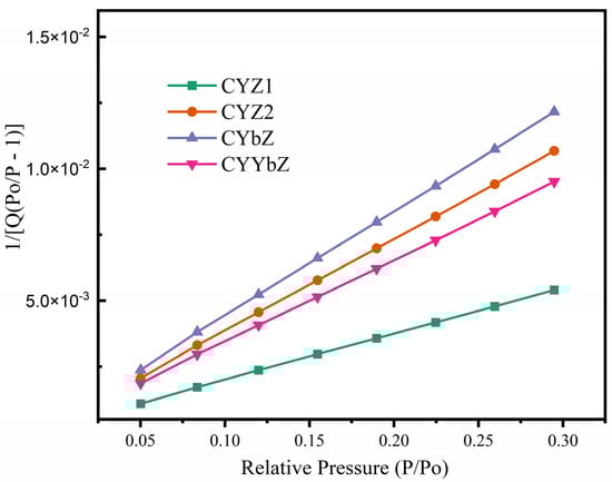 The BET specific surface areas of the CYZ1, CYZ2, CYbZ, and CYYbZ samples are shown in Figure 7. The BET surface area, constant C, and regression coefficient data for the four samples are presented in Table 3. It can be observed, based on the tabulated data, that the values of C for all samples fall within the range of 50–200, consistent with typical oxide characteristics. Moreover, all regression coefficients exceed 0.999, indicating excellent agreement between the adsorption lines of the samples (at P/Po = 0.05~0.35) and the BET equation. These results demonstrate a close correspondence between the test data and the actual specific surface area. As can be seen in Table 3, all four samples had large specific surface areas.