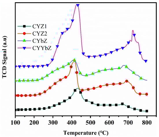 Figure 8 shows the H2-TPR test results. As can be seen in the figure, all four samples had three reduction peaks between 300 and 800 °C. The reduction peak near 300 °C corresponded to surface oxygen species adsorbed on the composite oxides. The reduction peaks between 400 and 500 °C belonged to reduction [], which occurred near 300 °C, showing that the transformation of the Ce4+/Ce3+ activation energy was reduced. That is, due to ion doping, the degree of crystal lattice distortion increased, resulting in a large number of lattice oxygen defects, improving the mobility of oxygen ions, and this process promoted the conversion between Ce4+ and Ce3+. Four samples had a high-temperature reduction peak between 600 and 800 °C, indicating the reduction temperatures of the bulk oxygen of multicomponent composite oxides. The high-temperature reduction peak of CYZ1 was between 600 and 700 °C, and the strength was weak because the content of Ce was very slight. The high-temperature reduction peaks of CYZ2 and CYbZ were around 700 °C and moved towards the high-temperature direction, and the strength increased because the content of Ce increased. The high-temperature reduction peak of CYYbZ was around 750 °C with a higher peak intensity. The interaction of the Yb and Y elements could produce more oxygen defects inside the multicomponent composite oxide crystal, and the defect association could make the crystal more stable. Therefore, the reduction peak intensity increased and migrated to a higher temperature.