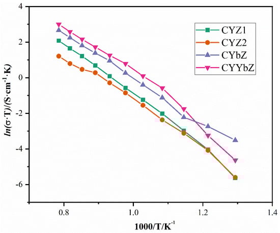 Table 5 shows the conductivity values of the samples at different temperatures, and Figure 9 shows the Arrhenius curves of the sample conductivity at different temperatures. It can be seen that the conductivity of the samples increased uniformly with the increase in the test temperature, and the logarithm of the conductivity had a linear relationship with the temperature, which satisfied the Arrhenius relationship well. It can be seen in the table that at 1000 °C, the conductivity values of CYZ1 and CYZ2 were 0.006284 and 0.00264 S·cm−1, respectively, and the conductivity values of CYbZ and CYYbZ were 0.01129 and 0.01586 S·cm−1, respectively, indicating that the conductivity significantly improved after doping with Yb.
