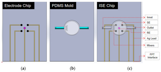 Detailed schematics of the microfluidic chip system for copper ion detection: (a) electrode microfluidic chip configuration; (b) PDMS mold design; and (c) ion-selective electrode microfluidic chip.