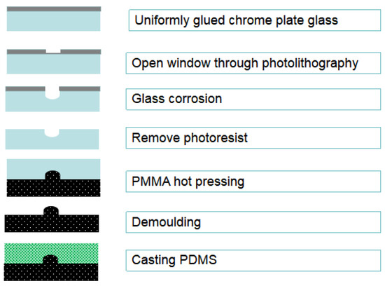 The microfluidic chip PMMA mold is prepared by using the hot pressing method. After photolithography, the evenly glued chromium plate glass substrate is placed in a glass corrosion solution at 40 °C and corroded for 15 min. After photoresist removal and chromium removal, a glass substrate with microgrooves is obtained. The glass substrate with microgrooves is tightly adhered to the PMMA substrate, and the PMMA mold is pressed by a computerized laminating machine.