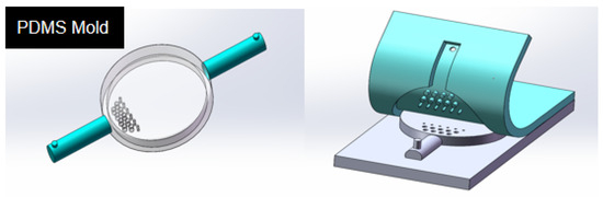 The prepolymer and curing agent of PDMS are combined at a mass ratio of 10:1. Following the removal of bubbles through stirring, a PDMS cover with a microcavity and a micro-flow channel is cast at a temperature of 75 °C (Figure 3). The PDMS cover is prepared and integrated with the electrode microfluidic chip to create an integrated ion-selective electrode microfluidic chip (Figure 1c). The diameter of the PDMS microreactor is 8 mm, and the thickness of the microreactor is 1.5 mm. The spacing between the microfilters in the microreactor is about 1 mm.
