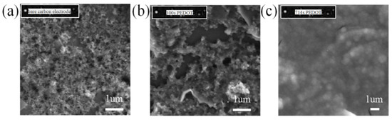 SEM images of PEDOT/PSS membrane development: (a) bare carbon electrode; (b) PEDOT/PSS deposited for 300 s; and (c) PEDOT/PSS deposited for 714 s.
