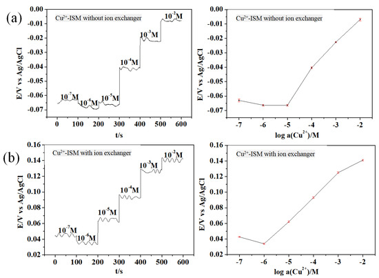 Figure 5a depicts the open-circuit potential response of solid copper ion-selective electrodes in the absence of the ion exchanger NaTFPB. The electrode potential stabilizes within 30 s and exhibits a linear response within the range of 1 × 10−5 mol·L−1 to 1 × 10−2 mol·L−1. The electrode exhibits a response slope of 20.7 mV/decade, and its detection limit is 1 × 10−5 mol·L−1. Figure 5b illustrates the open-circuit potential response of solid copper ion-selective electrodes containing the ion exchanger NaTFPB. The electrode potential stabilizes within 30 s and exhibits a linear response in the range of 1 × 10−6 mol·L−1 to 1 × 10−2 mol·L−1. The electrode response slope is 27.8 mV/decade, and the detection limit is 1 × 10−6 mol·L−1. The experimental results indicate that the detection limit performance of the solid copper ion-selective electrode containing the ion exchanger NaTFPB is superior. The detection limit is sufficient to meet the fundamental requirements for the on-site online detection of copper ions in boiler water.