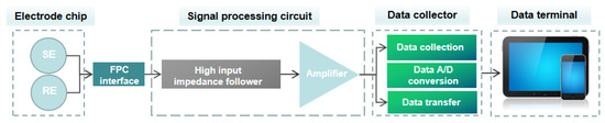 The potential detection device, designed to measure multiple potential differences simultaneously, is depicted in Figure 7. It comprises a signal processing circuit, a signal acquisition module, and a data terminal module. The electrode chip is connected to the signal processing circuit device through the flexible printed circuit board (FPC). The signal processing circuit is capable of conducting potential difference signal testing between the ASS-ISE and the solid-state reference electrode. The signal acquisition module is capable of performing analog-to-digital (A/D) conversion and transmitting multiple DC potential differences. The data terminal module has the capability to store and process data. The signal processing circuit involves the acquisition of the potential difference signal between the solid-state ion-selective electrode and the solid-state reference electrode, while ensuring minimal interference with the testing system.