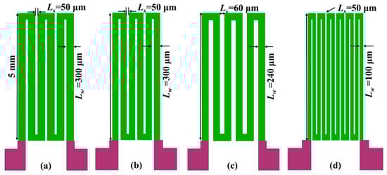 where σ is the conductivity of the magnetic material, μeff is the effective permeability, and f is the driving current in the soft magnetic material. The impedance of meanders will change significantly with the external magnetic field Hex. Then, the impedance of the meanders can be calculated by [,,,,]: