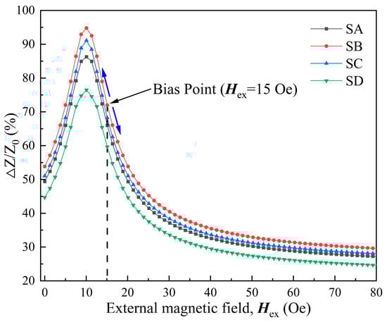 The design of the four different GMI probes are shown in Figure 1. We have simultaneously investigated the performance of these four GMI probes. The dependence of the GMI ratio of the probes on the magnetic field is shown in Figure 2. It can be seen from Figure 2 that with the increase in the magnetic field, the GMI ratios of the four probes show a tendency of increasing and then decreasing, which is a typical characteristic of the GMI effect. It can be briefly summarized as before the application of external magnetic field, the domain wall displacement is hindered due to the pinning effect, which prevents the magnetization process. When the external magnetic field is applied to the material, the domain walls are freed from the pinning restriction, which makes the magnetization process easier [], and the GMI ratio rises rapidly. When the external magnetic field continues to increase, the antimagnetized nuclei become antimagnetized domains in the presence of the external magnetic field, which leads to antimagnetization effects through domain wall displacement, and the overall magnetization efficiency of the material decreases, with a consequent decrease in the GMI ratio. It is observed that the anisotropic field of the ribbon is around 10 Oe, when the GMI ratio is at its maximum value. Among the four samples, sample SB has the highest GMI ratio of 94.7% (91.1% for SC, 86.3% for SA, 76.5% for SD). It is worth noting that the GMI ratio curve shows a monotonically decreasing trend when the applied magnetic field is larger than 10 Oe. It is obvious that the GMI probe has a good linear variation interval around 15 Oe. Therefore, we keep the operating point around 15 Oe by increasing the bias field.