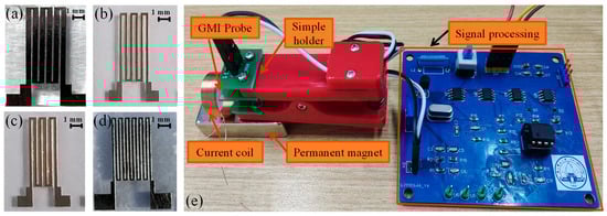 (a–d) are the fabricated GMI probes; (e) signal detection and processing unit.