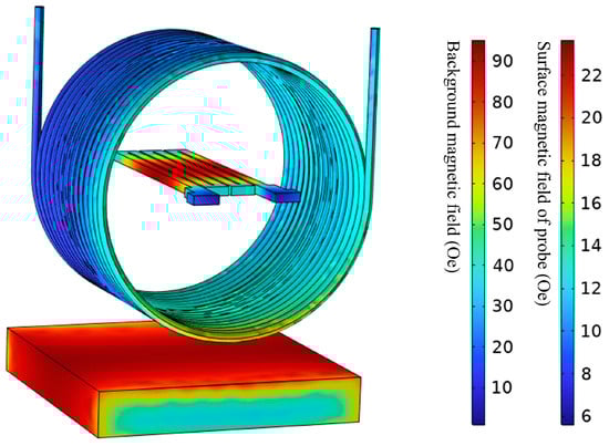 According to Ampere’s law and the right-hand rule, an energized coil produces a steady magnetic field in the axial direction concentrated mainly at the center of the coil. Taking the bias field provided by the permanent magnet and the magnetic field generated by the current to be measured as the background magnetic field, it is found that the magnetic field on the surface of the GMI probe is lower than the background magnetic field. The magnetic field at the surface of the probe is actually lower than ideal because of the magnetic field dissipation in space, as well as on the GMI probe [,].