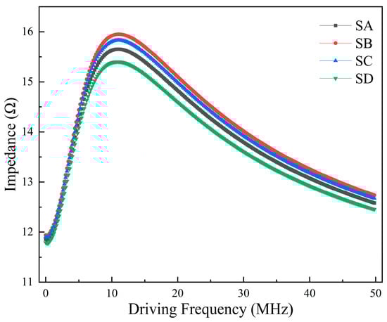 Keeping the background magnetic field conditions constant, the effect of the driving current frequency on the impedance in the GMI probe is analyzed. The impedance of the GMI probe increases as the frequency increases. And it shows a tendency to increase first and then decrease with the change in driving frequency. The impedance peaks at around 10 MH for all four samples. In particular, the change rate of impedance also showed a trend of first increasing and then decreasing. This phenomenon can be explained by the fact that the skinning effect on the GMI probe will be more pronounced when the background magnetic field is kept constant and the frequency of the driving current is gradually increased. It comes from an enhancement in the domain wall movement and domain rotation due to the influence of the applied constant magnetic field. The permeability of the GMI probe is altered, which results in the skinning depth becoming smaller, and its AC impedance changes significantly. As the driving frequency continues to increase, the magnetization rotation gradually dominates, leading to a decrease in the AC impedance [,], which can be explained by the ferromagnetic resonance theory. The impedance curve of the GMI probe is shown in Figure 7. Based on the simulation results, the driving current frequency is kept at 10 MHz in the experiments in order to improve the output voltage.