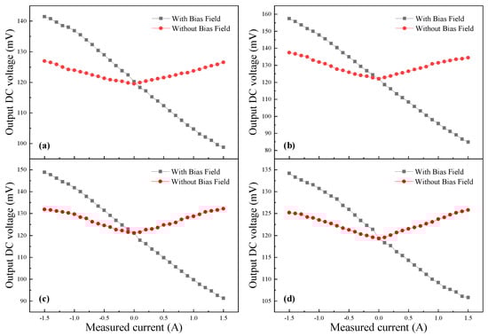 In order to test the voltage output characteristics of the sensor, different test conditions are set to test the performance of the sensor. Figure 8 shows the dependence of the output voltage on the measured current for four GMI probes with and without permanent magnets, respectively. A bias magnet is positioned directly below the GMI probe to provide a bias magnetic field. The bias magnetic field is set at 15 Oe. It can be seen from Figure 8 that with the presence of a biased magnetic field, the output voltage varies more linearly with the measured current. The output DC voltage has good linearity when the measured current varies in the range of −1.5~1.5 A. The output voltage of the probe SB has the best linearity and the largest output voltage in the range of 84.8 mV to 157.41 mV (98.8 mV to 141.52 mV for SA, 91.3 mV to 148.91 mV for SC, 105.8 mV to 134.2 mV for SD). Without the bias field, the linearity of the output voltage is relatively poor. The output voltage varies linearly only within a small range, and it is discontinuous when the measured current direction changes.