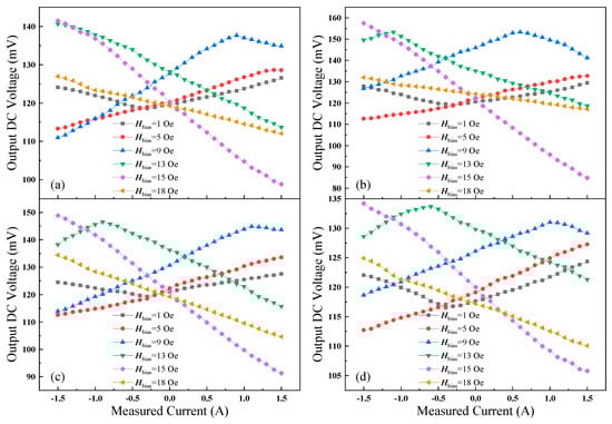 The dependence characteristics of the output voltage on the measured current for four different GMI probes. (a–d) are samples SA–SD.