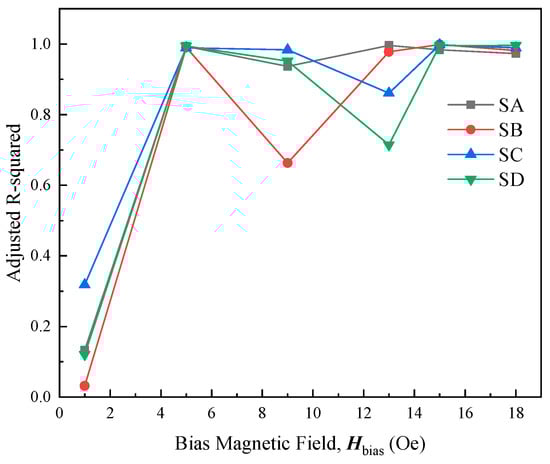 To find out the nonlinear error of the sensor output voltage, several measurements have been completed in the current range of ±1.5 A. The adjusted R-squared is utilized to indicate the nonlinearity error of the test system output voltage (the adjusted R-squared closer to 1 indicates a lower nonlinearity error). The adjusted R-squared curves for different bias magnetic fields are shown in Figure 10. Different bias magnetic fields have a large effect on the nonlinearity error. In particular, the nonlinear error varies greatly for different probe types at the same bias magnetic field. It is clearly indicated that the adjusted R-squared values of the four probe types can reach more than 0.99 when the bias magnetic field is 15 Oe, and their nonlinear errors are at a low level, as expected.