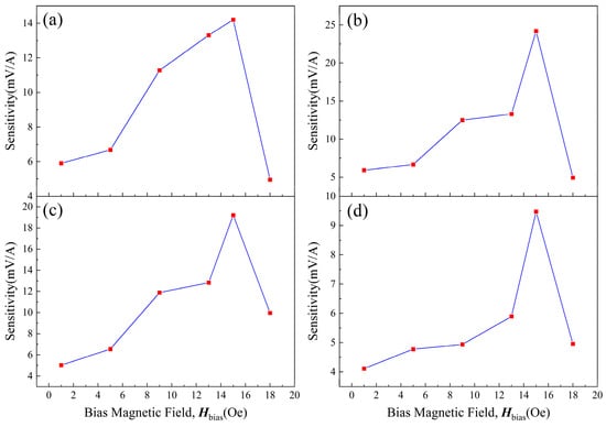 Sensitivity is an important parameter to evaluate the performance of a sensor. The sensitivity of the four GMI probes is shown in Figure 11. The sensitivity of the four GMI probes showed a trend of first increasing and then decreasing. The peaks of sensitivity were observed at Hbias = 15 Oe. Among the four GMI probes, the sample SB has the highest peak of sensitivity up to 24.2 mV/A (14.20 mV for sample SA, 19.2 mV for sample SC, and 9.47 mV for sample SD). The sensitivity decreases as the bias field rises (when Hbias > 15 Oe), and this phenomenon is due to the fact that the GMI ratio decreases as the magnetic field continues to increase. But when the bias magnetic field is 1 to 13 Oe, the sensitivity is also lower than 15 Oe. This may be attributed to the large distance between the permanent magnet and the GMI probe, which means that the magnetic field applied to the GMI probe is unevenly distributed. As the probe is further away from the permanent magnet, the magnetic field becomes weaker and less uniform. And this inhomogeneity is expressed, not only in intensity but also in direction. It leads to the GMI probe not being uniformly magnetized in the longitudinal direction.