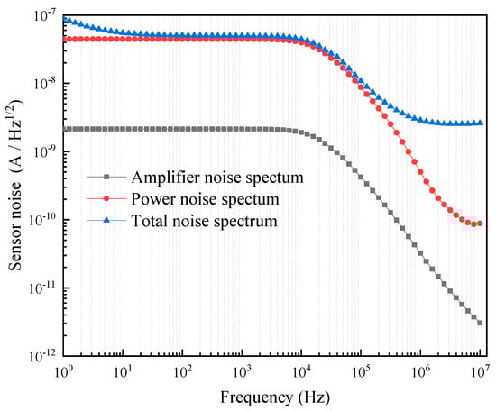 The noise will have an impact on the sensitivity and accuracy of the acquired signal, and the overall noise profile of the sensor is an important parameter to measure the performance of a sensor []. The main sources of the noise in the test system are the power supply as well as the amplifiers, which were measured separately. The noise curve of the test system in this design is shown in Figure 12. It can be clearly seen that the noise generated by the power supply is significantly higher than the noise generated by the amplifier. The noise of the test system is generally within a relatively lower level in the high-frequency range. Reducing the power supply and amplifier noise can further improve the sensitivity and accuracy of the test system.