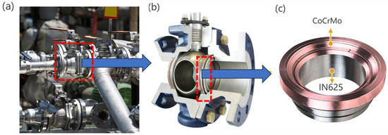 In the aerospace, petrochemical, and nuclear industries, the majority of the components operate in harsh environments, and are extremely vulnerable to wear and corrosion, as well as thermal fatigue damage. For example, the acidic liquid flowing in the valves of a chemical plant can easily corrode the valve core, thus requiring special corrosion resistance treatment (Figure 1). Often, multiple components need to be assembled together or additional spraying and strengthening treatment [1,2,3,4]. Conventional techniques aimed at bolstering corrosion resistance, including fusion welding and the application of hot or cold coatings, are often ineffective for long-serving valve components and similar parts when it comes to utilizing dissimilar alloy joining techniques [5,6,7,8]. This is because the corrosion-resistant alloy coating is very thin and not resistant to erosion, and the interface area between the two alloys is weak, which is likely to be the site of cracks due to local strain and cannot be used for a long time. Co-based alloys exhibit high temperature resistance, excellent wear resistance, and good wettability with nickel-based alloys during the laser cladding process, making them a viable and robust option for securely amalgamating these two metals [9,10,11,12]. As an alternative to these, in order to extend the service life of current valves, improve the metal’s erosion corrosion resistance, reduce plant downtime, and reduce operating costs [13,14,15], the IN625 valve core base is covered with 10 mm-thick CoCrMo through laser-based powder bed fusion (LPBF) technology.