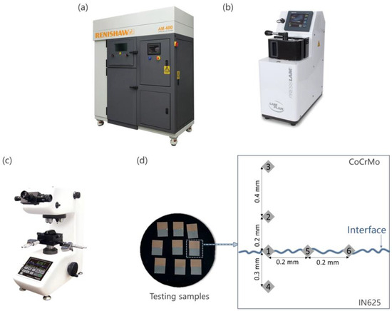 (a) Renishaw AM400 LPBF printer, (b) PRESSLAM 1.1 hot mounting press, (c) FM300e hardness tester, and (d) testing samples with indicated positions of Points 1, 2, 3, 4, 5, and 6 where hardness being measured are shown alongside. Silvery grey CoCrMo is visually represented in brown colour in this figure to aid distinction.