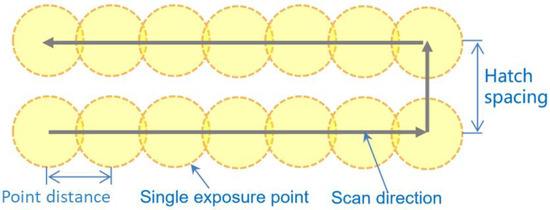 Unlike CW lasers, the input of PW laser operates intermittently, impacting the energy input. The measurement of volumetric energy density (Ev) is crucial in evaluating laser energy input, it represents the average applied energy per unit volume of metals during the scanning of one layer [39]. Equation (1) addresses the calculation for volumetric energy density, Ev (J/mm3), with a CW laser emitter [40]. However, adjustments are necessary for pulsed laser emitters, as shown in Equation (2), ensuring an accurate quantification of the parameter combinations detailed in Table 2.