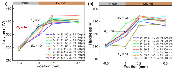 The interface hardness of CoCrMo/IN625 within the transition range at the laser power of 250 W. (a) Layer-by-layer printing of powder without double melting; (b) only the first three layers of powder experience double laser melting.