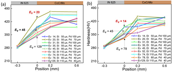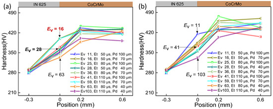 The comparison between (a) and (b) in Figure 4, Figure 5 and Figure 6 reveals a similar trend in interface hardness variations between IN625 and CoCrMo concerning changes in Ev. When Ev is at or below 20 J/mm3, considered inadequate, it results in a small melt pool with a depth of 25 μm and a width of 102 μm, as depicted in Figure 7c. Microfluidic forces (Marangoni forces and surface tension) struggle to facilitate adequate transfer between the two metals, hindering sufficient diffusion between them. Upon pressing the indenter of the hardness tester against the middle of the interface fusion zone, the insufficiently diffused high-hardness CoCrMo provides support, leading to a notably higher interface hardness. However, due to the presence of low-hardness IN625 near the interface, the interface hardness is lower than pure CoCrMo hardness (450 HV), ranging between 350 and 420 HV, with the maximum hardness close to the CoCrMo hardness.