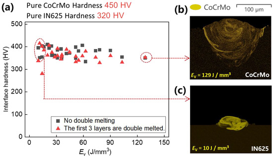 As Ev > 20 J/mm3, hardness gradually decreases with the rising laser volumetric energy density. This occurs because an increase in Ev results in larger melt pool depth (152 μm) and width (210 μm), allowing microfluidic forces (Marangoni forces and surface tension) to exert greater influence. In particular, the intense recoil pressure generated after metal vaporization disrupts the melt pool significantly, promoting thorough diffusion between the metals (Figure 7b). Upon pressing the indenter of the hardness tester against the middle of the interface fusion zone, the fully diffused and dissolved high-hardness CoCrMo gets diluted by the low-hardness IN625, leading to a noticeable reduction in interface hardness. As the laser volumetric energy density (Ev = 129 J/mm3) increases, the dilution of high-hardness CoCrMo becomes more pronounced, resulting in a smaller interface hardness. At this point, the interface hardness ranges between 331 HV and 390 HV, with the minimum hardness close to the IN625 hardness (320 HV). To enhance understanding of Ev’s influence on the interface hardness of the two metals, Figure 7a was generated using data from Figure 4, Figure 5 and Figure 6. As anticipated, increased Ev corresponds to heightened alloy amalgamation (Figure 7b,c), resulting in a gradual reduction in interface hardness.