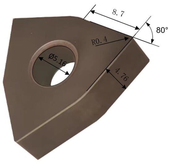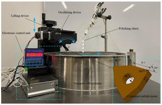 The CMSP platform is composed of a Nanopoli-100 polisher (Hangzhou Zhibang Nanotechnology Co., Ltd., Hangzhou, China), a lifting device, a fixture, an oscillating device, and an electric control device, as shown in Figure 1. The insert is fixed on the fixture with a screw. The fixture is connected to the oscillating device with the screws. The oscillating device is connected to the lifting device with the screws. The lifting device is mainly composed of a ball screw pair. The lifting device is adjusted to bring the insert edge in contact with the polishing pad and apply a certain polishing pressure. The polishing slurry is supplied by a peristaltic pump to drip onto the polishing pad at a certain flow rate. Meanwhile, the oscillating device is controlled by an electronic control device to swing the insert edge periodically within a certain angle range. The polishing slurry continuously flows through the insert edge with the rotation of the polishing pad. The oxidant in the polishing slurry reacts with the cutting edge to form a layer of oxide film. At the same time, the oxide film is removed by the mechanical action of the abrasive particles in the polishing slurry. The formation and removal of the film are alternated continuously. Therefore, the cutting edge preparation can be realized.