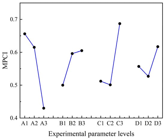 To obtain the overall optimal parameter combination of polishing slurry, combining Table 5 with Table 9, the MPCI response for each factor at their corresponding levels is obtained, as shown in Figure 4.