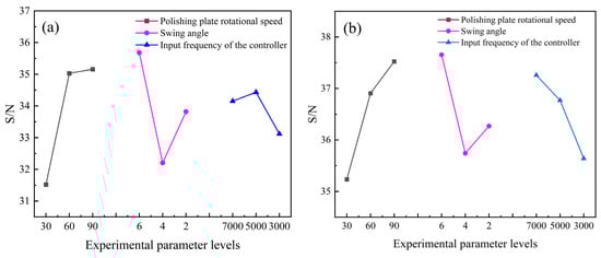 The average response of S/N for each factor at their corresponding levels: (a) linear edge, (b) circular edge.