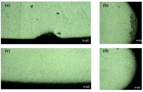 In Figure 7 and Figure 8, it can be seen that the initial cutting edge has some defects in the edge region such as burrs, poor surface finish, micro-breakages, and irregularities along the edge. After the cutting edge is prepared with the best combination of CMSP parameters, the defects are completely removed, and the cutting edge is smooth. So CMSP can improve the surface quality of the cutting edge. Therefore, in the actual cutting process, it can effectively reduce tool wear, improve the machining process stability, and reduce the machined surface quality.