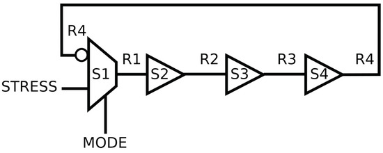 To control the operating mode of the RO, we implement a multiplexer as the first stage of the RO (see Figure 1). In measurement mode, the RO loop is closed in order to measure the RO signal. In stress mode, which corresponds to of the time, the RO loop is open and a stress signal passes through the RO. This enables us to study the effect of the stress signal (internal stress) on RO degradation.