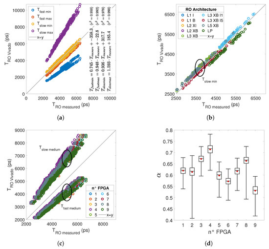 Comparison of the measured and extracted RO period from Vivado for (a) all ROs of 1 FPGA, (b) Slow Min with a different colour by RO architecture, (c) Fast Medium and Slow Medium with different colours by FPGA, and (d) dispersion of the alpha coefficient.