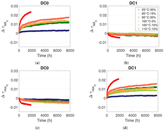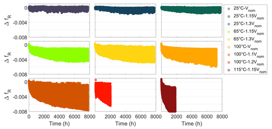 We observed that the effect of ageing on the relative frequency of all the ROs is a progressive drift. We did not observe any catalectic failure of the ROs, which suggests that we did not observe a hard TDDB. Figure 6 shows degradations between and . We can clearly see the effect of temperature and voltage on degradations. Thanks to the test bench accuracy, we observe degradation of about under stress conditions similar to operating conditions: 25 °C and . Under the same temperature and voltage conditions, we observe dispersed degradation. These differences in degradation demonstrate the significant effect of the FPGA’s internal configuration (stress frequency and duty cycle, RO architecture) on ageing. After approximately 2000 h of the ageing test, the FPGA development boards at 100 °C and 1.2 and 115 °C and 1.15 stopped working, and after around 7500 h of operation, the 100 °C and 1.1 FPGA board stopped working. This is probably due to the failure of a component on the development board.