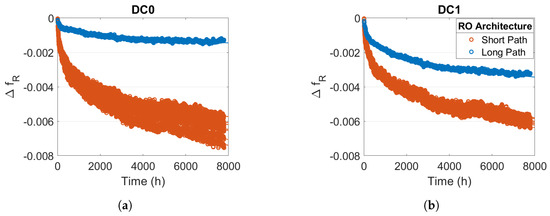 Relative frequency degradation for ROs Long Path (blue) and ROs Short Path (orange) with C and (a) for DC0 stress (b) for DC1 stress.