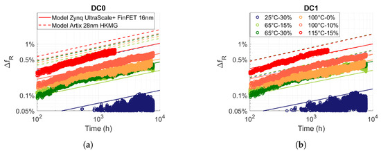 Figure 9 shows our measurements (circle) of relative frequency degradation for different temperatures and voltages and for static stress DC0 and DC1. We performed a nonlinear regression between the measurements shown in the figure and the model (8). Figure 9 confirms the consistency between the modelling (full line) and our measurements. Finally, in the figure, we plotted the degradation model obtained in [26] (dashed line), which we adjusted to the same temperature and voltage conditions as our measurements. In general, Figure 9 reveals higher degradation on the Artix 28 nm HKMG than on the UltraScale+ 16nm FinFET for static stress, which is the most stressful condition.
