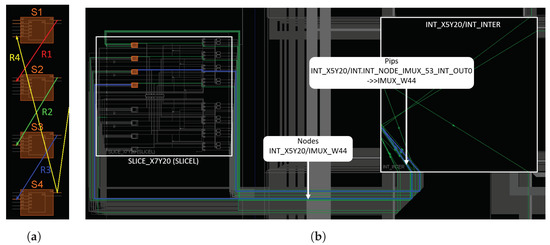Figure 10b shows the detailed floor plan with interconnection details of the FPGA. The four LUTs of the RO are coloured orange. Signal R3 (blue) connects stage S3 to stage S4. To achieve this, the FPGA uses a routing network built around an interconnection matrix. To connect S3 to S4, signal R3 uses nodes and PIPs (Programmable Interconnect Points). A PIP is a configurable circuit that connects two nodes together [32]. For example, PIPs “INT_NODE_IMUX_53_INT_OUT0 IMUX_W44” connects both nodes INT_NODE_IMUX_53_INT_OUT0 and IMUX_W44.