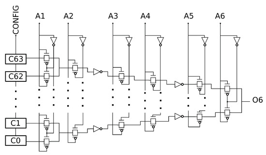 Simplified diagram of the internal architecture of a 6-input LUT based on the patents [30,31].