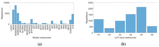 Figure 12a displays the number of nodes, by category, used to implement all the ROs. A total of 37,869 node resources are used to implement the 567 ROs. There are a total of 28 node categories, but in our implementation, only 23 node categories are used. The name of the node indicates its direction and length in the routing network. Nodes EE, WW, SS and NN are connections, respectively pointing east, west, south or north in the FPGA. The signal length can be 1 site, 2 sites, 4 sites or 12 sites. The other node categories are local connections between neighbouring logical and interconnection sites. Because a PIP connects two nodes, there are PIP categories, which is why we have not plotted the PIP numbers used.