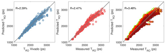 Once the ROs are implemented in the FPGA, it is possible to use a TCL script to extract implementation information from Vivado. For every RO, we extracted time propagation given by Vivado which returns four delay references: , , and . and refer to the inter-FPGA variation (process corner) and and refer to the intra-FPGA variation. The delay corresponds to the maximum delay in the fastest FPGA, and the delay corresponds to the minimum delay in the slowest FPGA. Figure 5a compares RO periods measured with the four delay references given by Vivado: we can see consistency between the measured and Vivado data. The linear factor indicates that measures are close to the and references.
